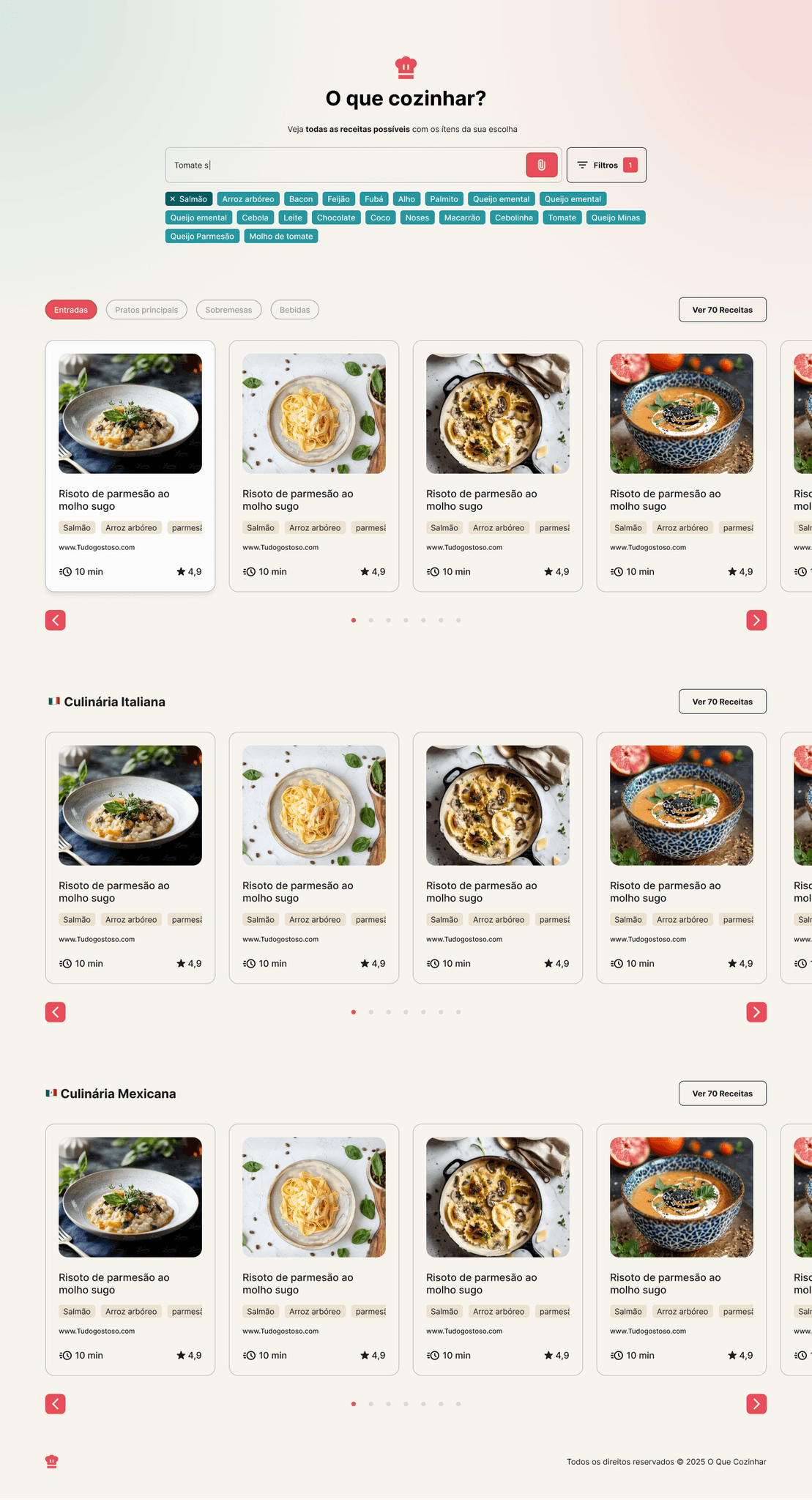 Navegação direta, sem menus complexos, garantindo que o usuário encontre rapidamente algo interessante para cozinhar.