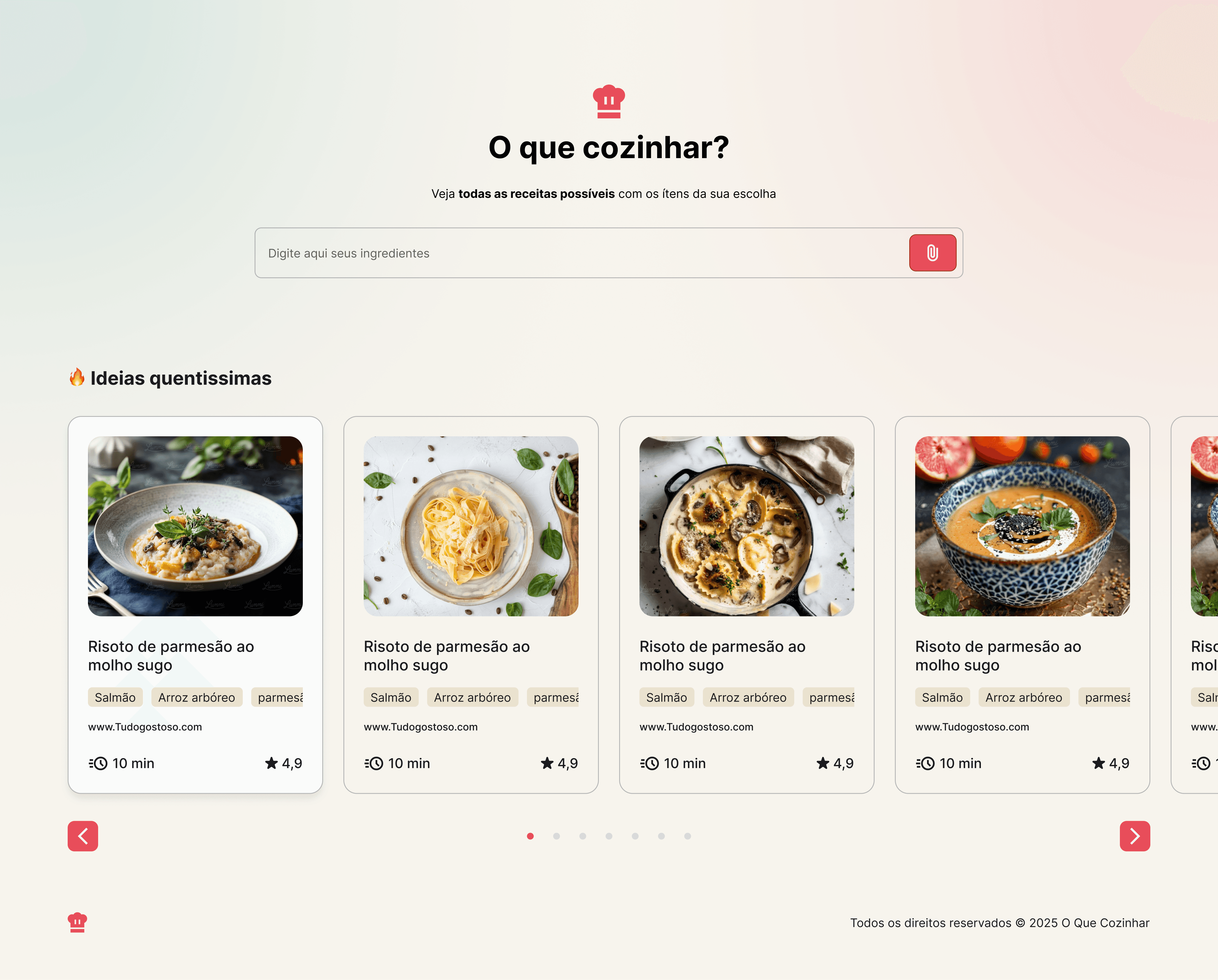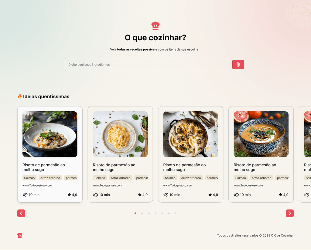 Ao digitar, colar ou subir uma lista de ingredientes, o sistema reconhece automaticamente os itens, cruza com uma base de dados dos maiores sites de receitas e apresenta sugestões por relevância exibindo imagem, tempo de preparo e principais ingredientes.